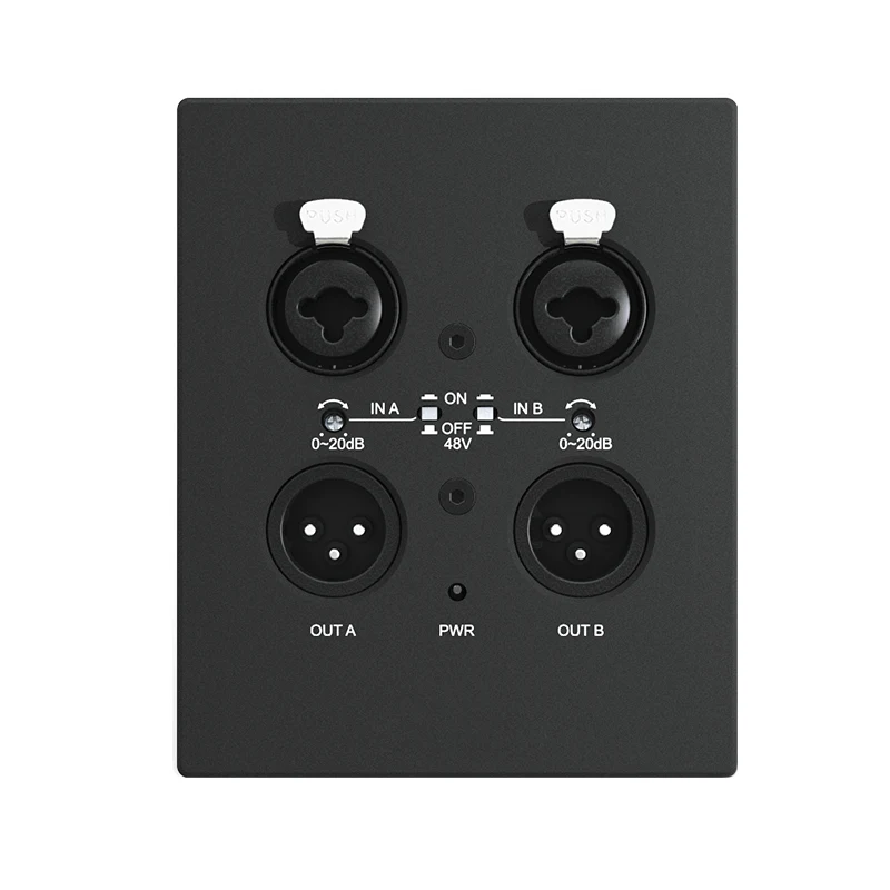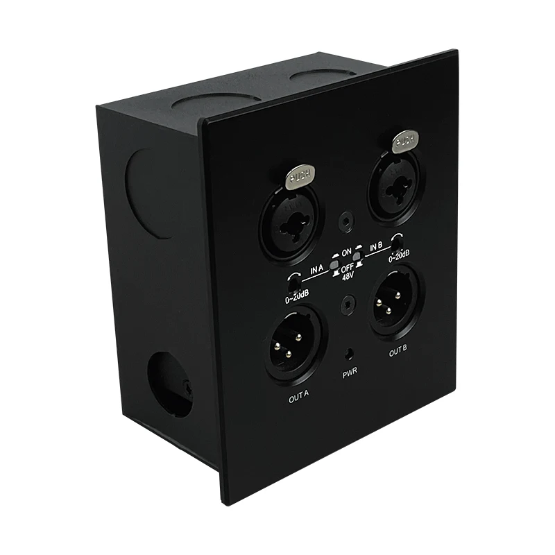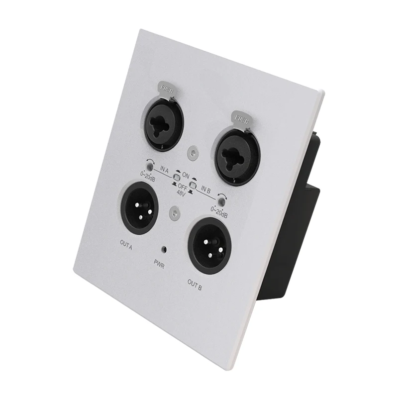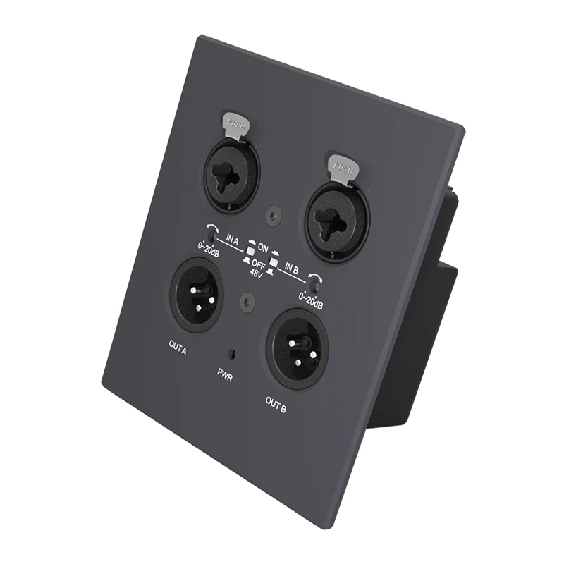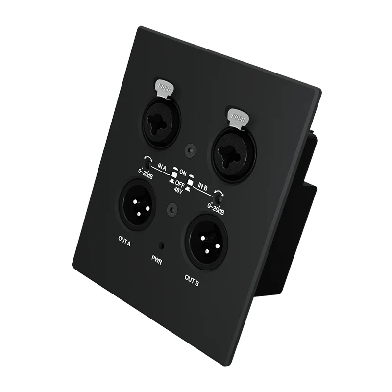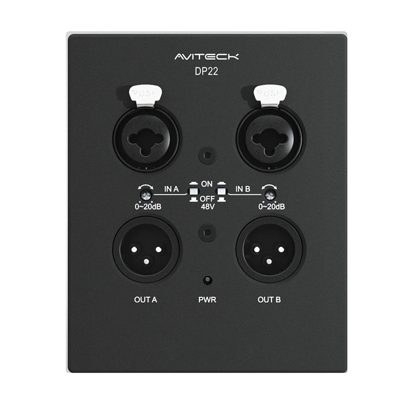 Az FHBAVTEC® Dante 2 CH Wall Plate Network Audio interfész (DP22) beépített Dante modulja van analóghoz a Dante Digital Signal Transferhez és egy kétcsatornás bemeneti fantomteljesítmény-kapcsolóhoz. Egy másik nagyszerű tulajdonság az, hogy poe -permetezett lehet.